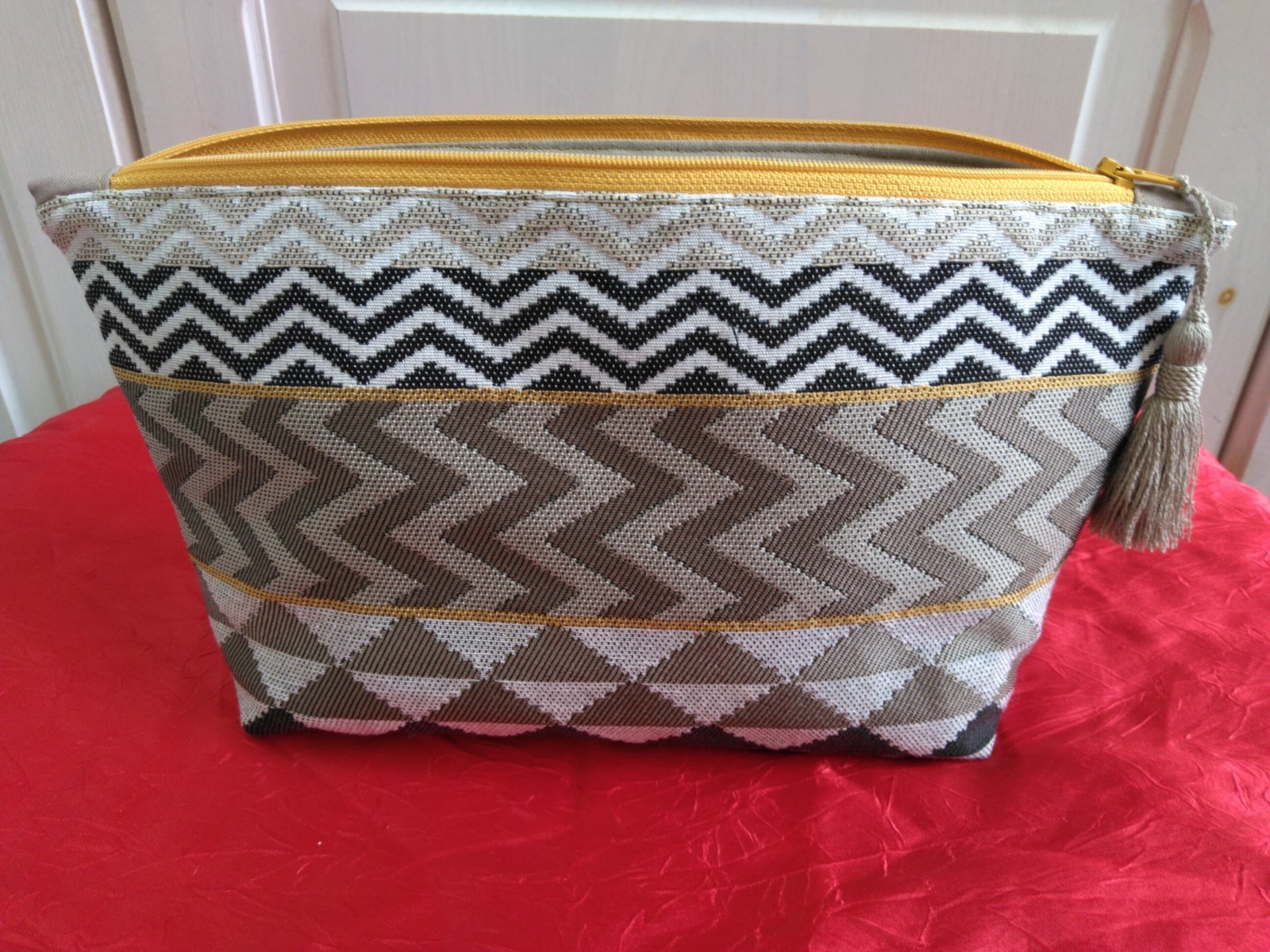 Réalisée en tissu jacquard "géométrie taupe". La doublure est en coton taupe ainsi que le pompon. Le zip est jaune. Les coutures sont renforcées pour la solidité. Fait mains.