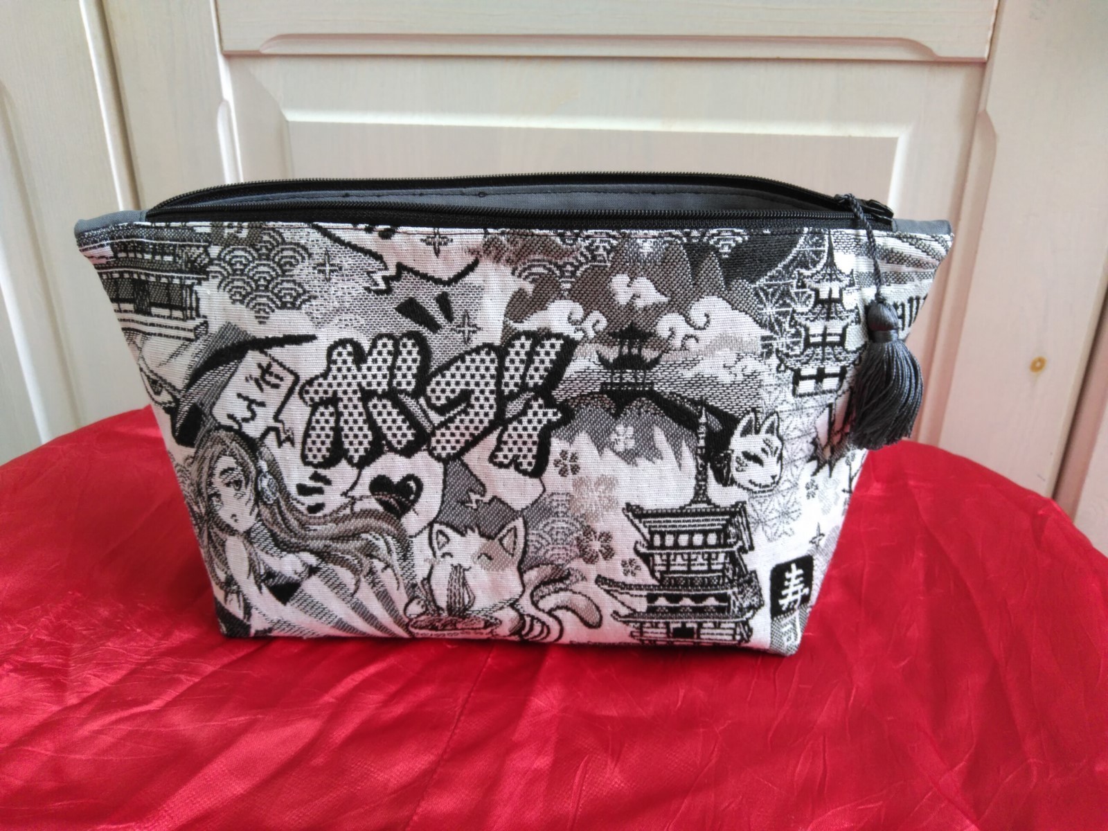 Réalisée en tissu jacquard "Manga". Doublure coton gris, zip noir et pompon gris. Coutures renforcées pour la solidité. Fait mains