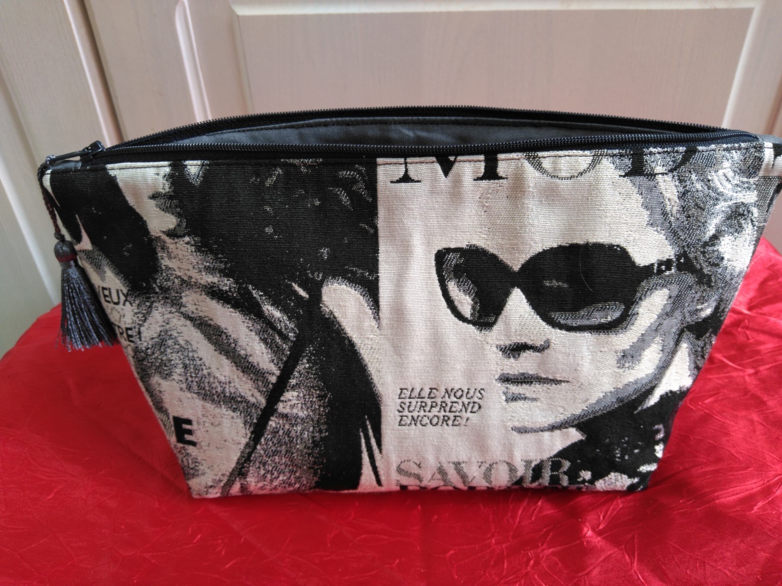 Réalisée en tissu jacquard "Visages". La doublure est en coton gris ainsi que le pompon. Le zip est noir. Les coutures sont renforcées pour la solidité. Fait mains.