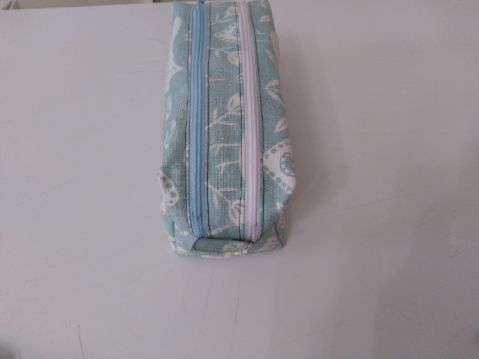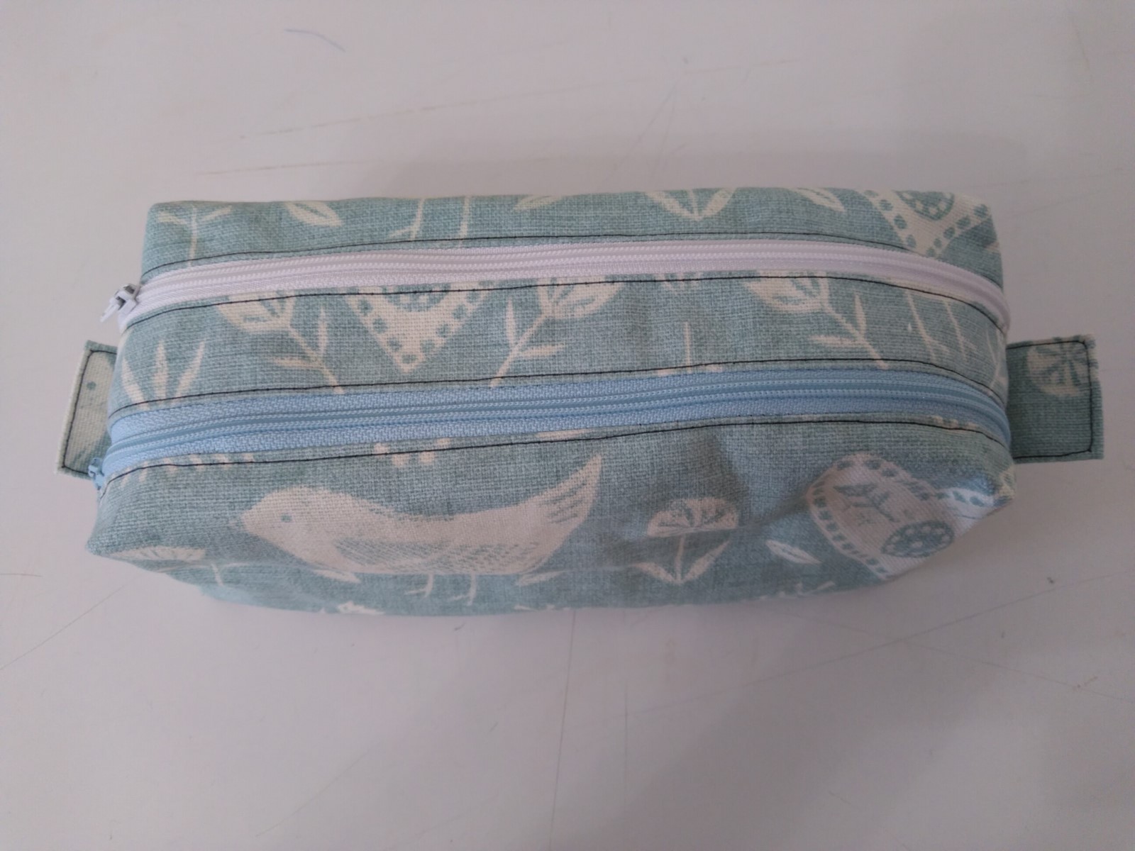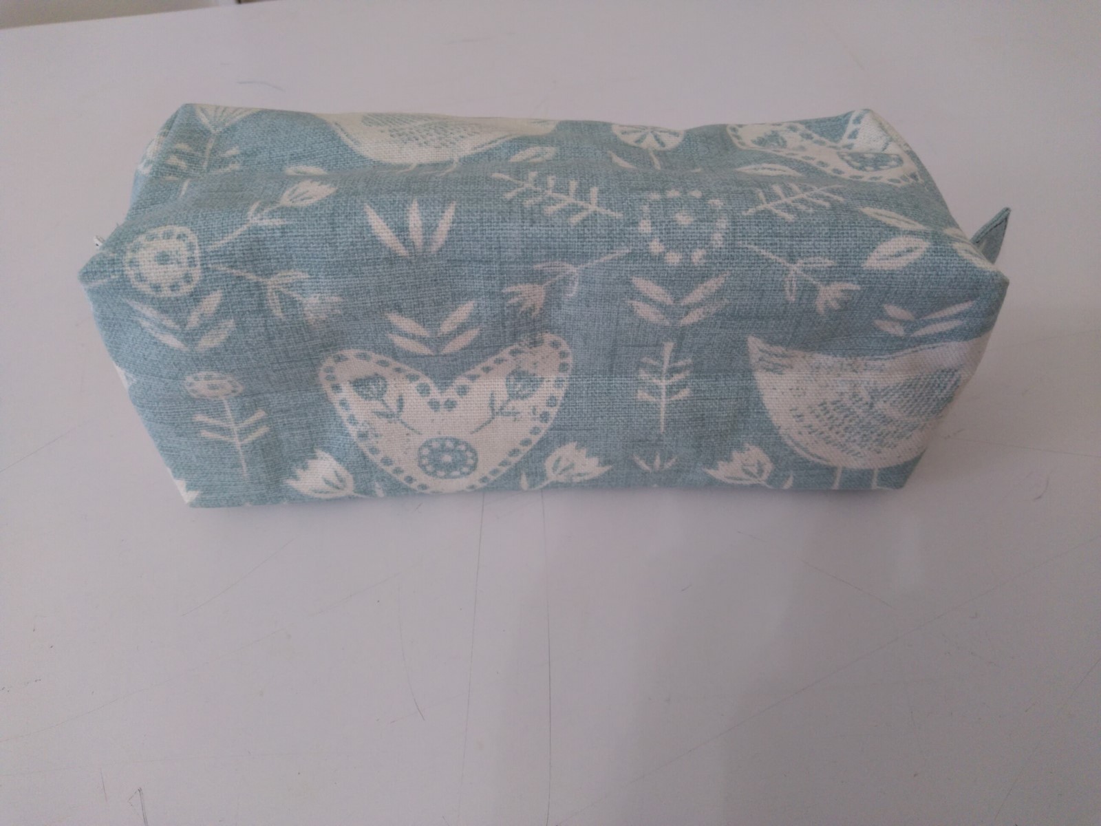 Réalisée en tissu jacquard bleu imprimée oiseaux. Doublures bleue et blanche. Zips de fermeture bleu et blanc. Coutures renforcées. Fait mains