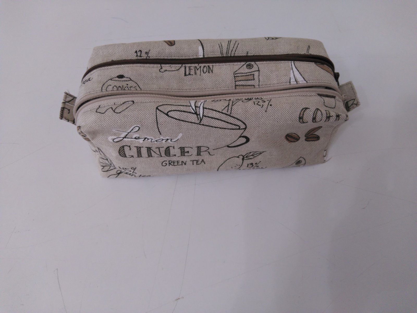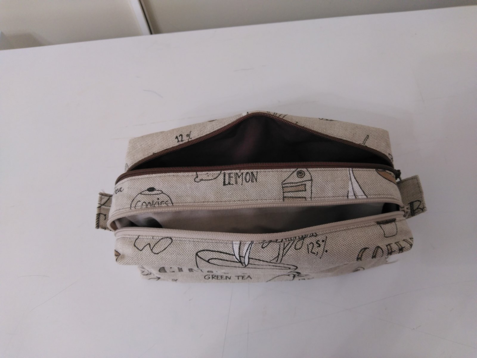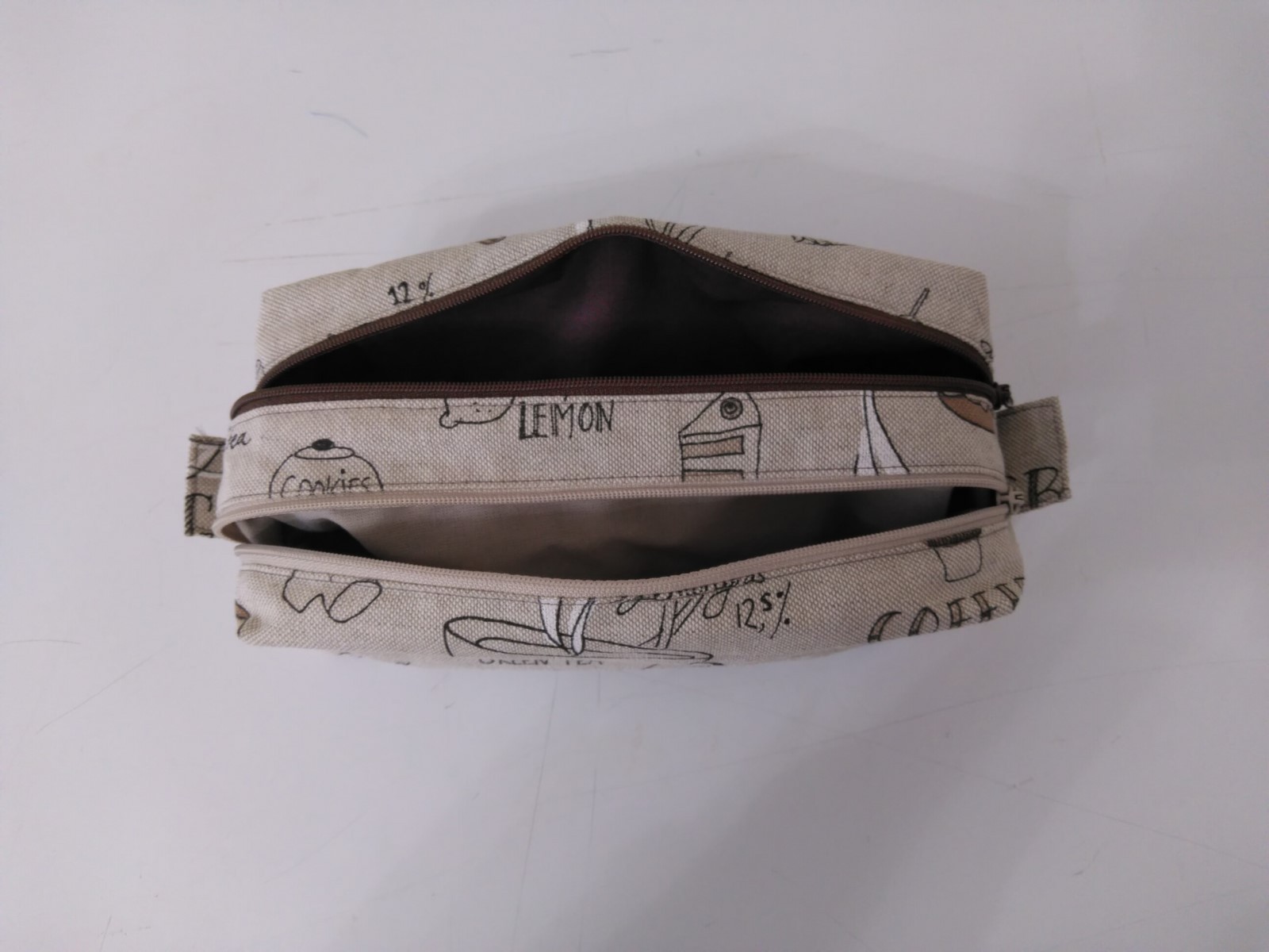 Réalisée en tissu jacquard lin imprimée café. Doublures coton taupe et brun. Zips de fermeture taupe et brun. Coutures renforcées. Fait mains