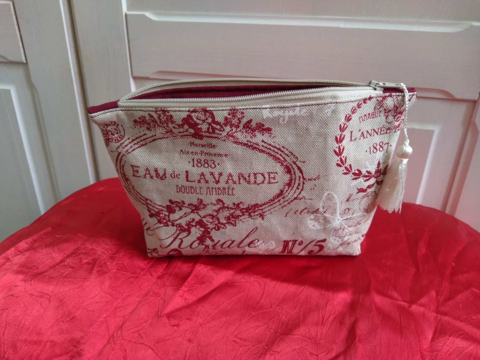Réalisée en lin naturel imprimé "Eau de lavande" rouge. Pompon blanc, zip lin et doublure coton rouge. Fait mains.