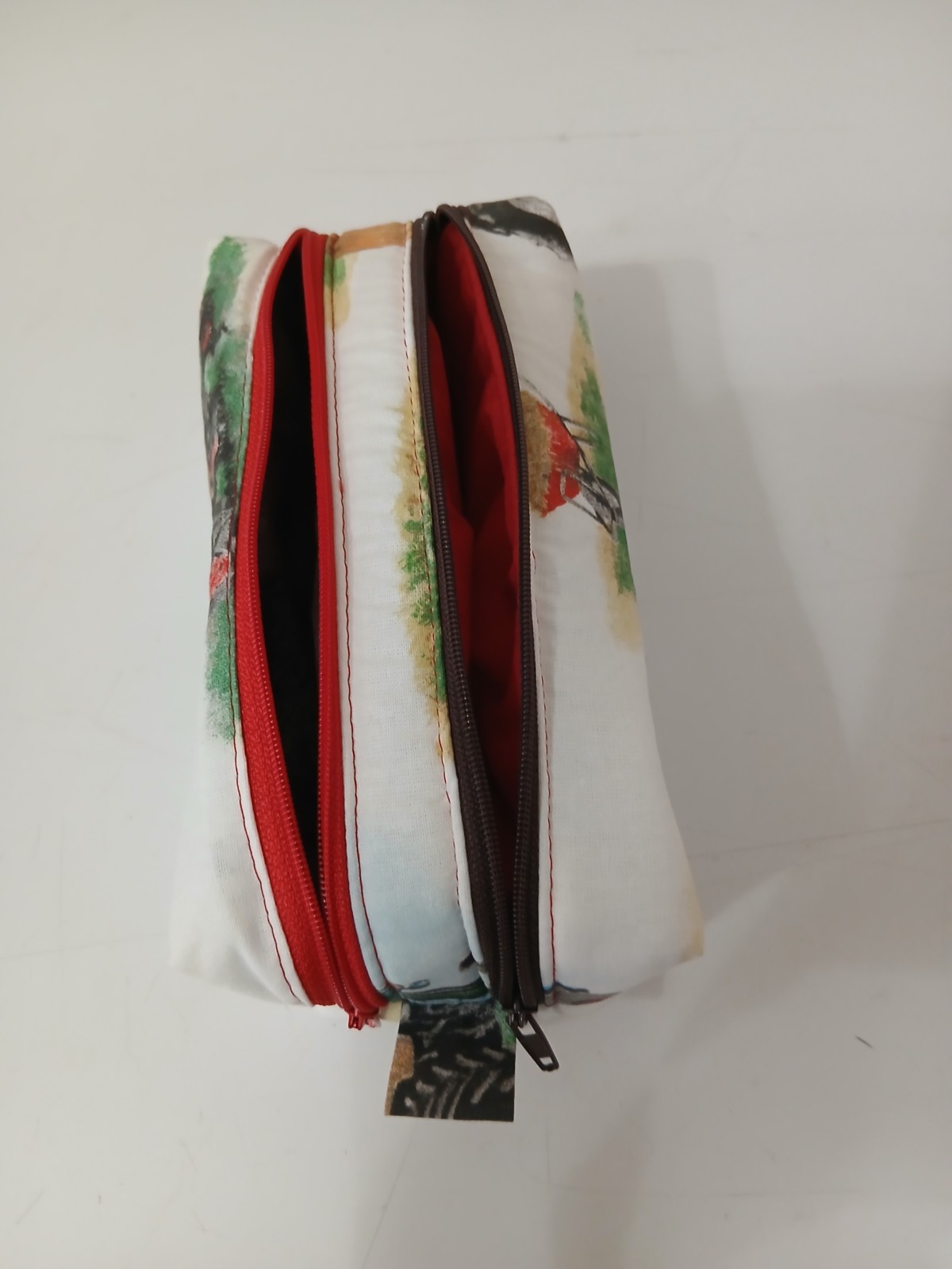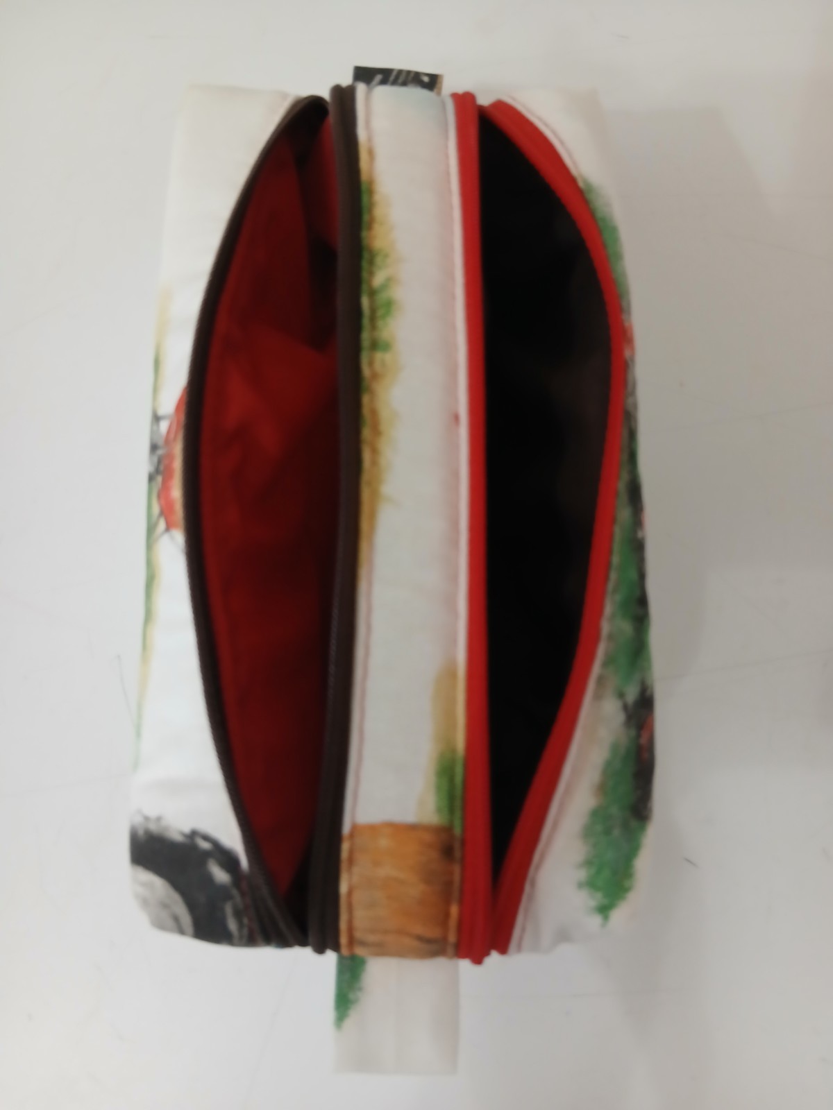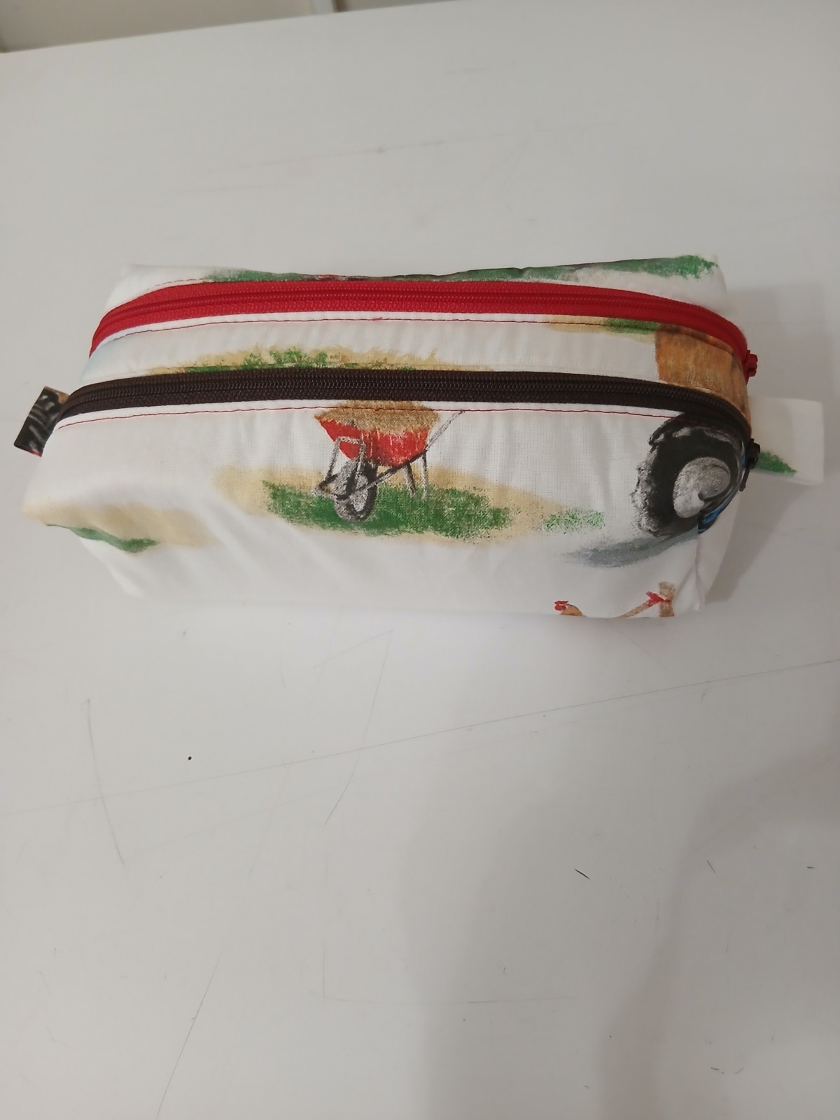 Réalisée en tissu coton imprimé tracteur et coton unis marron et rouge pour les doublures intérieures. Zips rouge et marron. Matelassage fait à la main. Coutures renforcées. Fait mains.