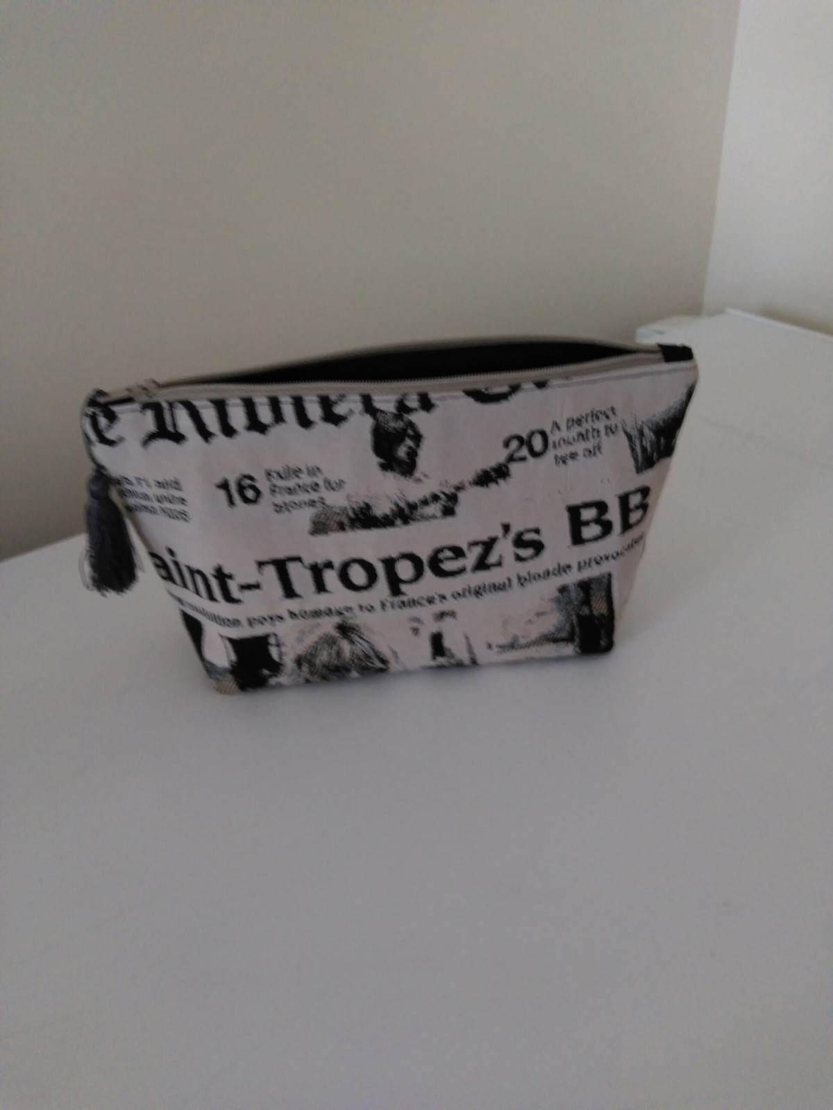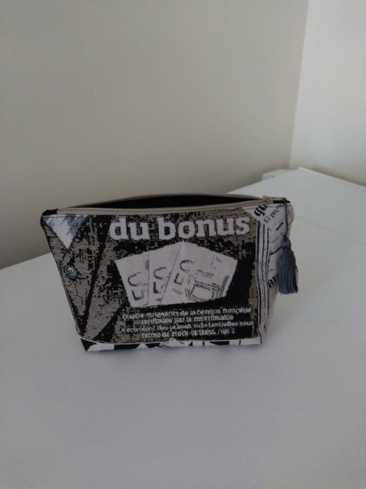 Tissu jacquard écru imprimé New York Times beige et noir. Fermeture beige et doublure coton noir. Pompon anthracite d'agrément. Les coutures sont renforcées pour plus de solidité. Fait mains.