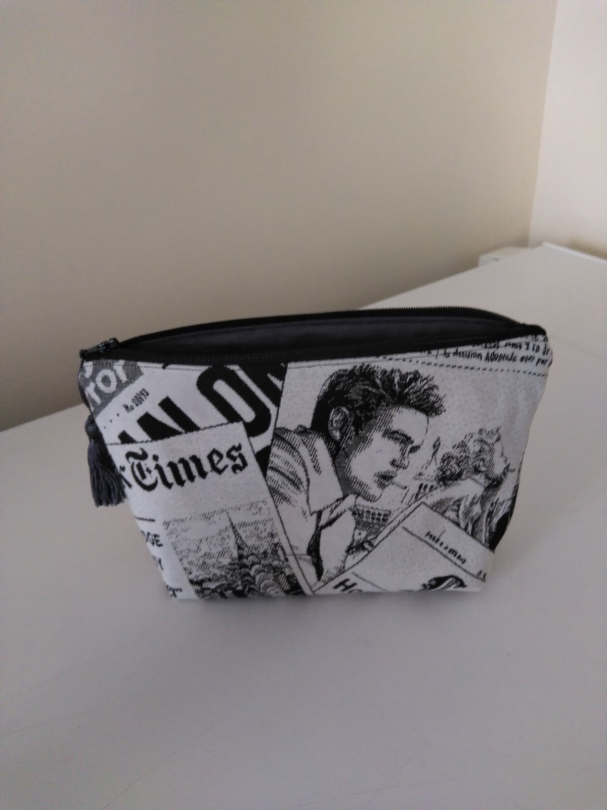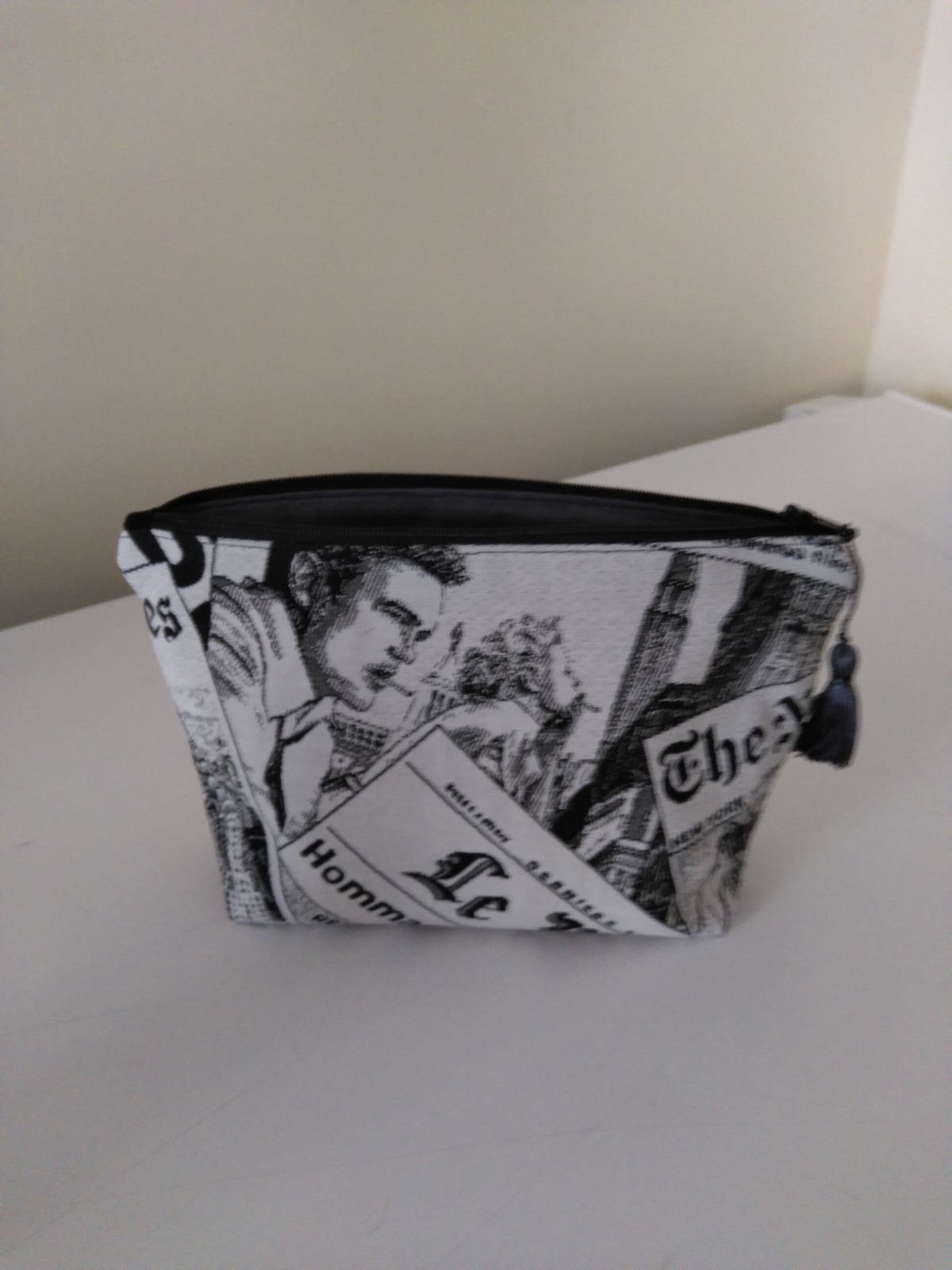 Tissu jacquard cinéma noire et gris. Doublure coton noir et fermeture noire. Pompon d'agrément anthracite. Les coutures sont renforcées pour plus de solidité. Fait mains.