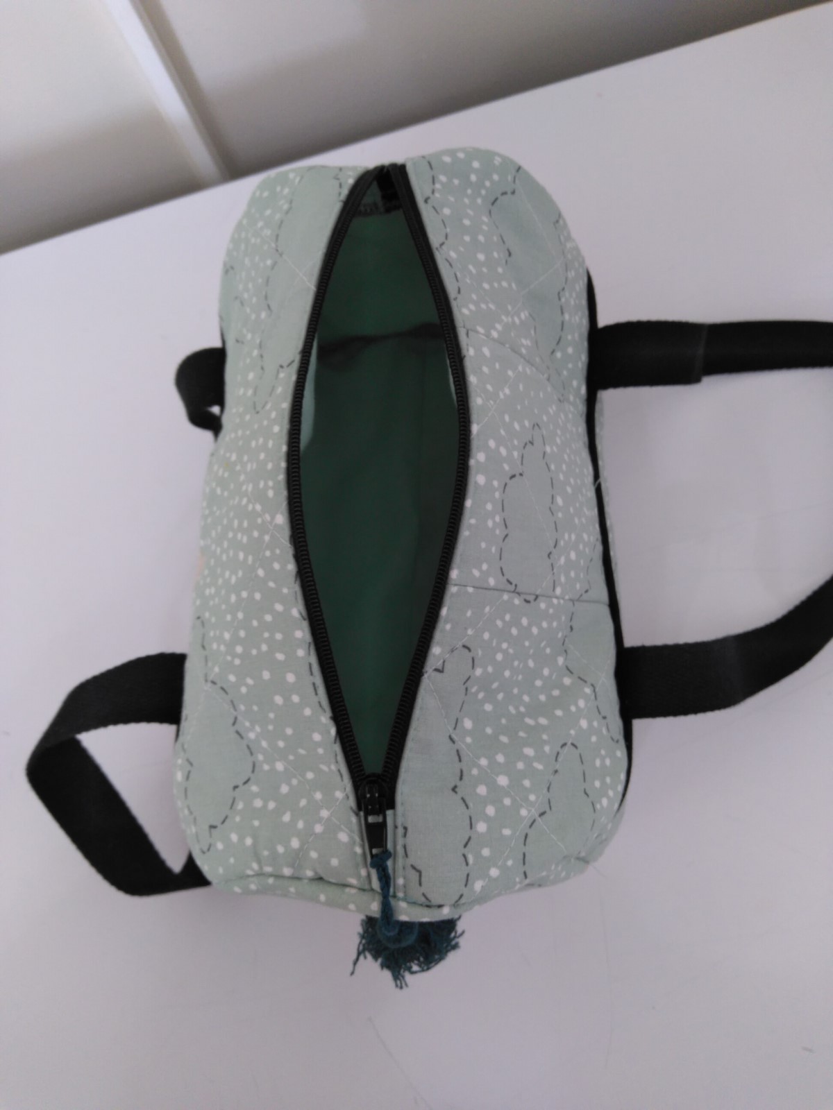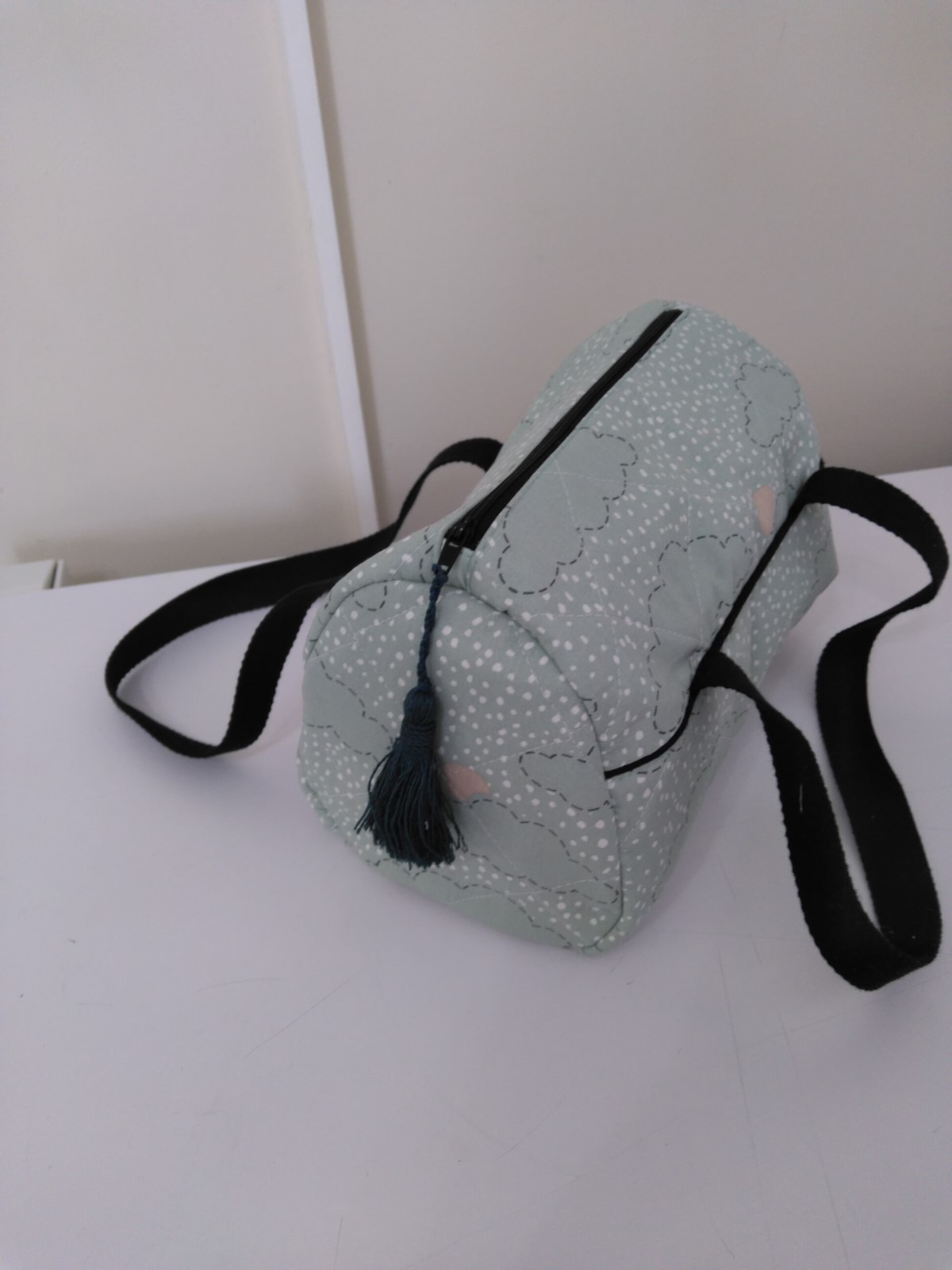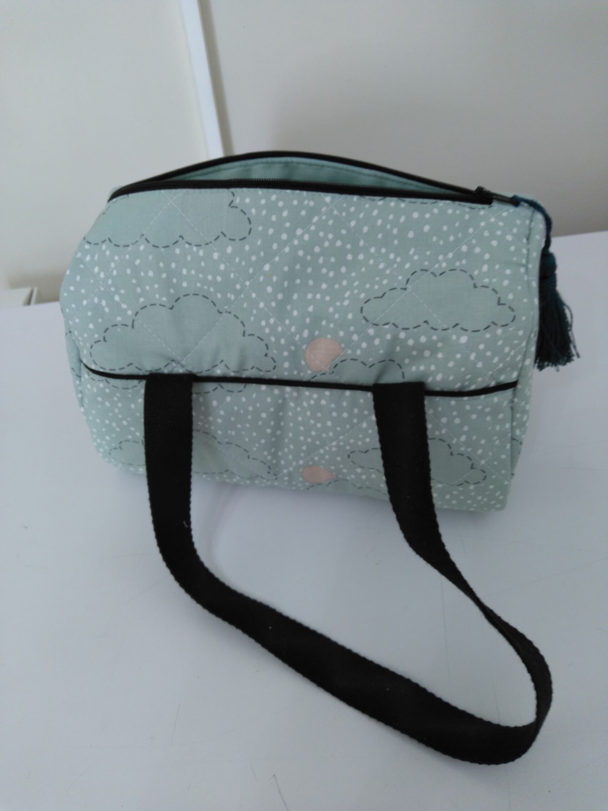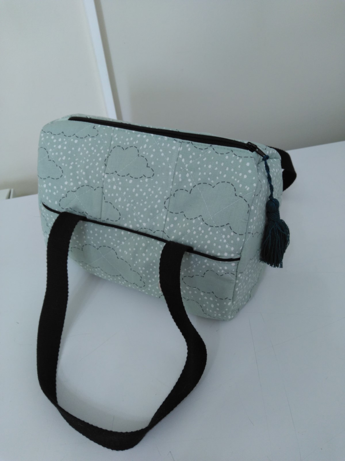 Fait avec un tissu molletonné vert imprimé nuages. Doublure coton vert. Fermeture par zip. Sangle coton noir. Coutures renforcées. Fait mains.