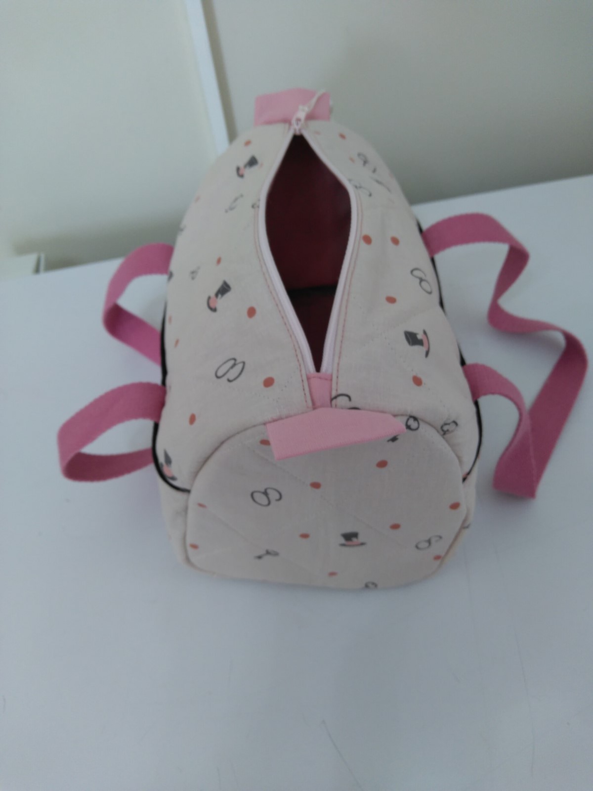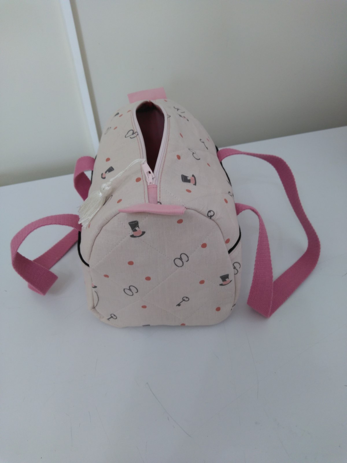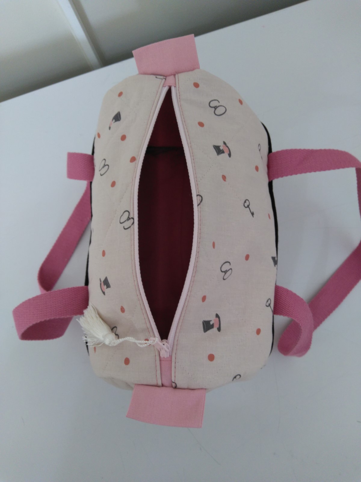 Fait en tissu molletonné écru imprimé chapeaux et pois roses. Doublure coton bordeaux. Fermeture par zip. Finition passepoil noire. Sangles coton rose. Les coutures sont renforcées. Fait mains