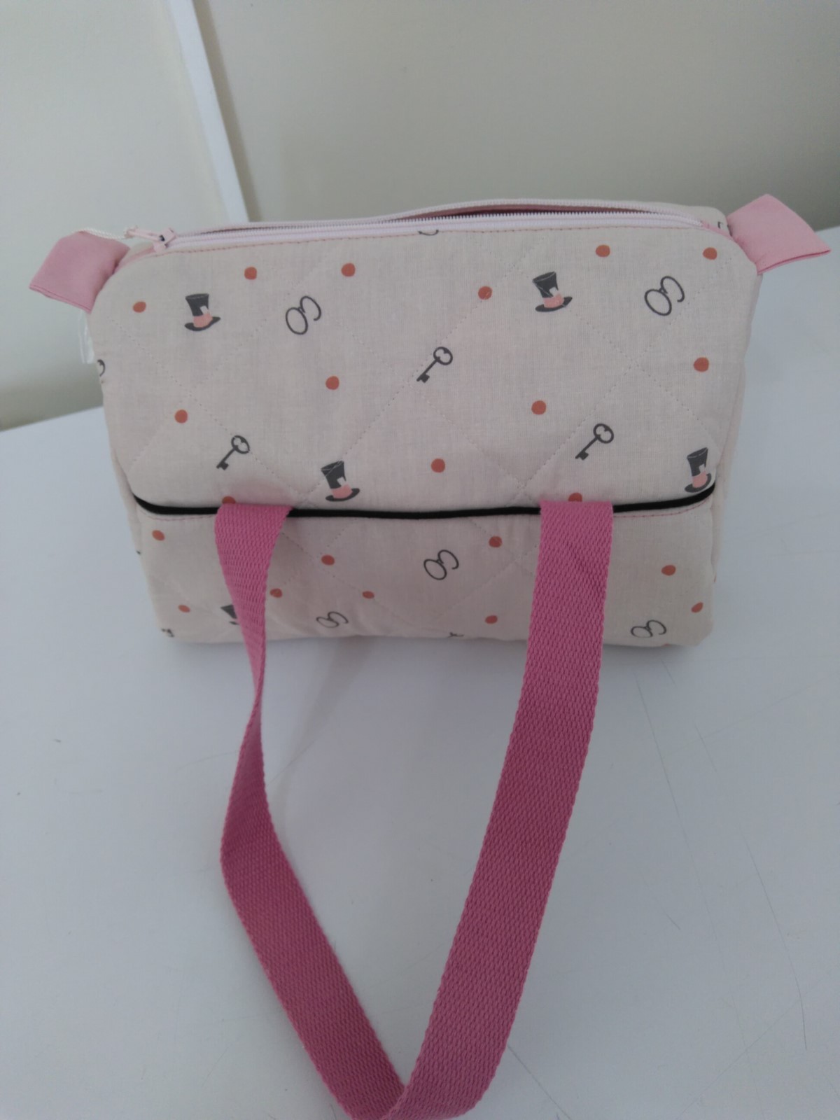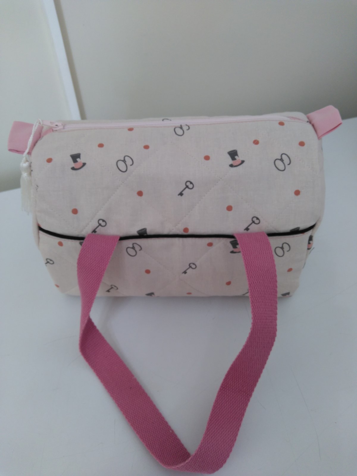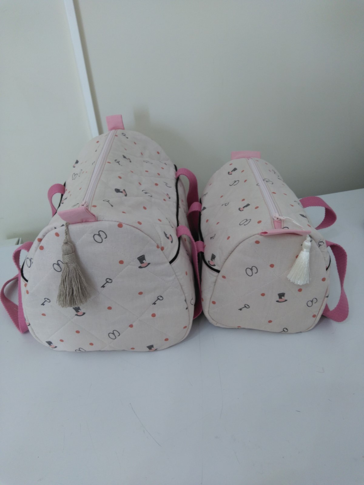 Fait en tissu molletonné écru imprimé chapeaux et pois roses. Doublure coton bordeaux. Fermeture par zip. Finition passepoil noire. Sangles coton rose. Les coutures sont renforcées. Fait mains